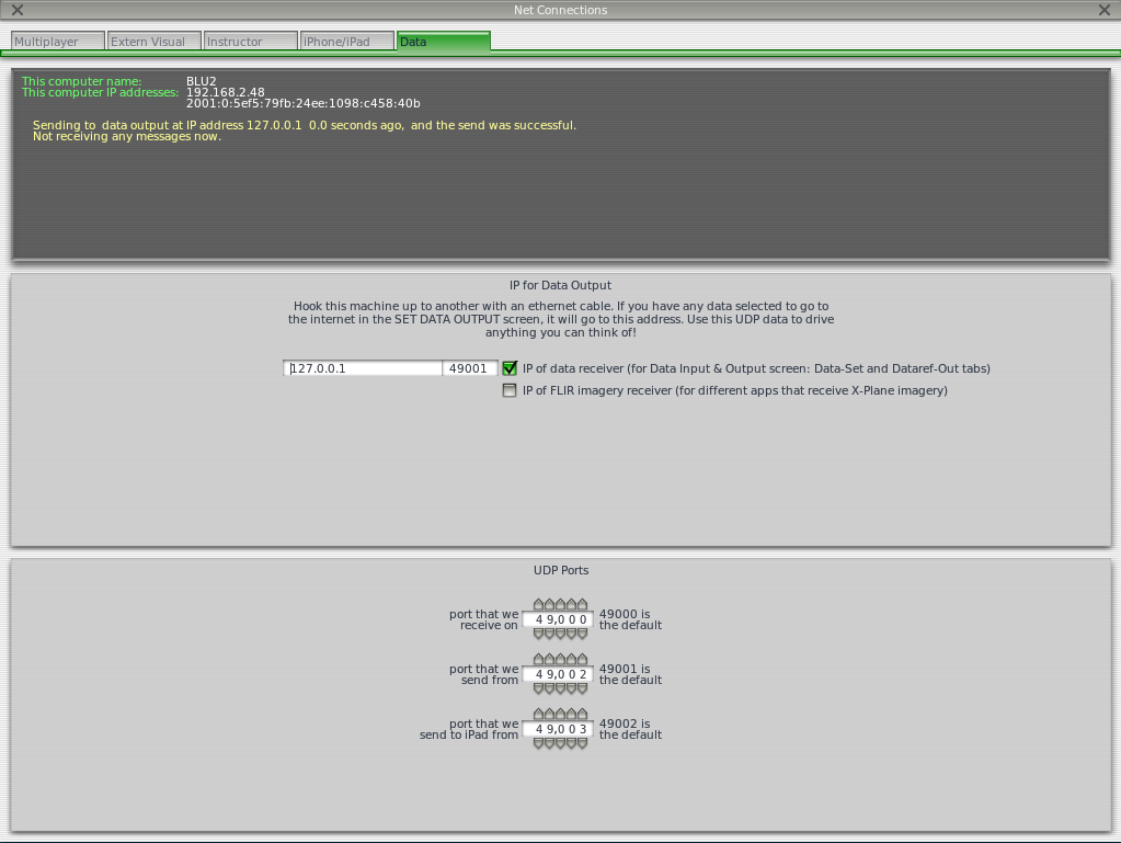 Go to the Settings -> Net Connections menu in X-Plane and then to the Data tab. Set the right IP address, and set the destination port number as 49001. Make sure that the receive port is 49000 (the default). If using loopback (ie. 127.0.0.1) then you also need to make sure the “port that we send from” is not 49001. In the example below 49002 is used.
