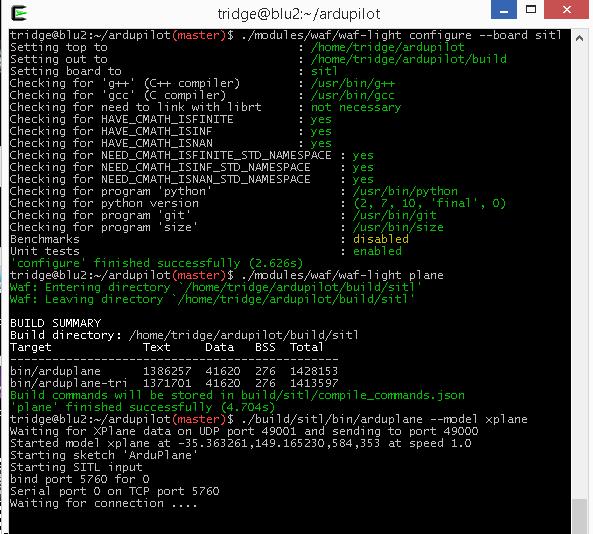 Then do a git checkout of ArduPilot master and change directory to the ArduPlane directory. I like to create a sub-directory for each aircraft I fly in SITL so that settings are remembered per-aircraft. If you want to do that then create a subdirectory in the ArduPlane directory and run sim_vehicle.py from there. In the following example I will be using the PT60 aircraft in X-Plane, so I create a PT60 directory: