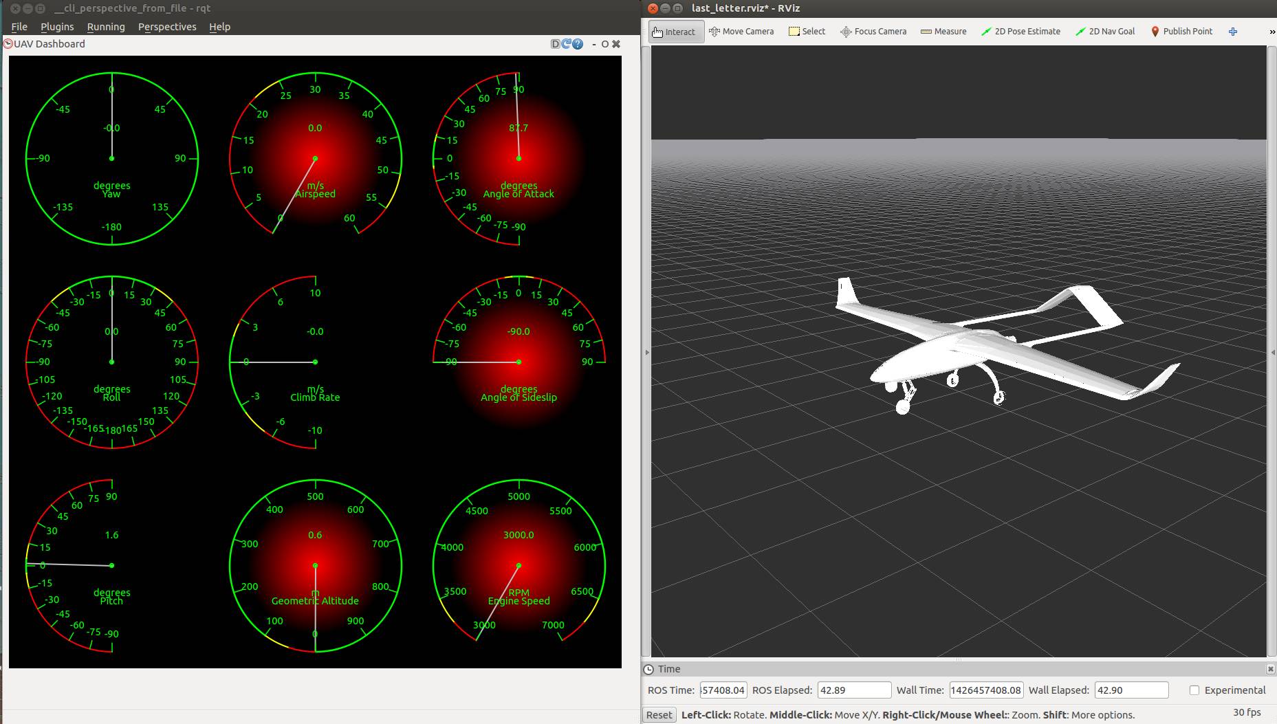 last_letter is a flight simulator written mostly in C++ under the ROS framework. It incorporates a modular description of the airplane model, modeling aerodynamics, propeller and motor dynamics, ground reactions, wind and gust disturbances and much more. Its structure allows for relatively easy coding of additional functions, and offers the potential for a unified simulator for all platforms, compatibility with other ROS packages and a modular, detailed simulation solution.