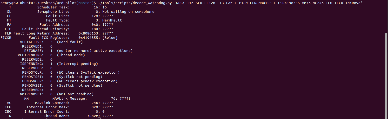 ./Tools/scripts/decode_watchdog.py 'WDG: T16 SL0 FL128 FT3 FA0 FTP180 FLR8080153 FICSR4196355 MM76 MC246 IE0 IEC0 TN:Rove'