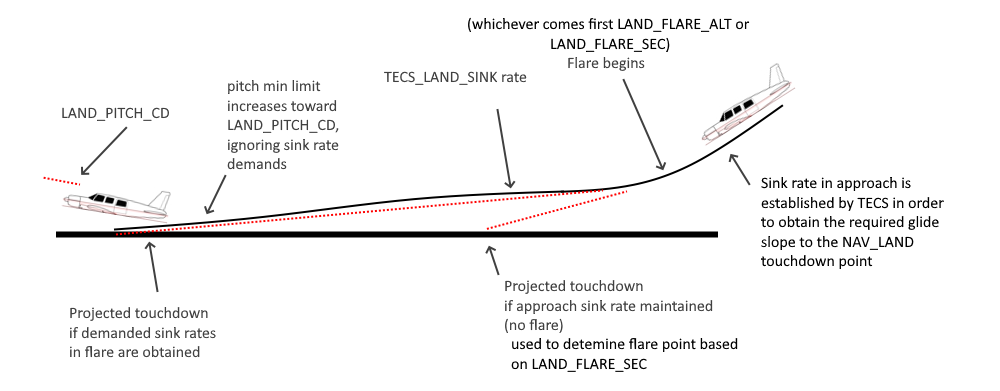 The transition from the glide-slope sink rate to the flare sink rate is controlled by the TECS_FLARE_HGT parameter and should normally be set below LAND_FLARE_ALT. The start of the flare will occur at LAND_FLARE_ALT and the sink rate will be gradually adjusted to TECS_LAND_SINK at the TECS_FLARE_HGT to avoid a rapid pitch change at the beginning of the flare, which would tend to create a “ballooning” effect at the start of the flare. See note at the end of this section for a possible exception to having TECS_FLARE_HGT set lower than LAND_FLARE_ALT.