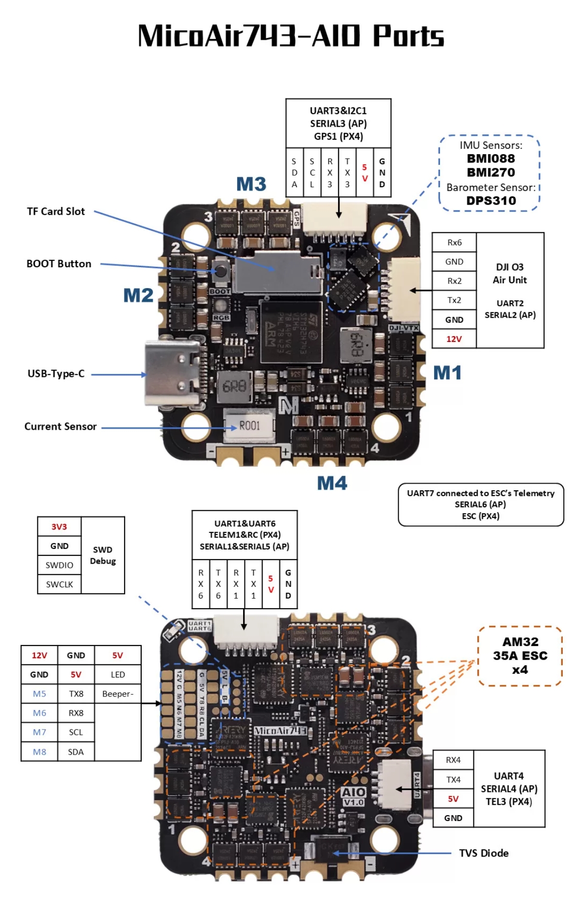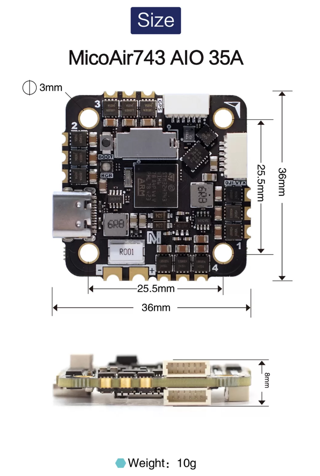 The MicoAir743-AIO is a flight controller designed and produced by MicoAir Tech.