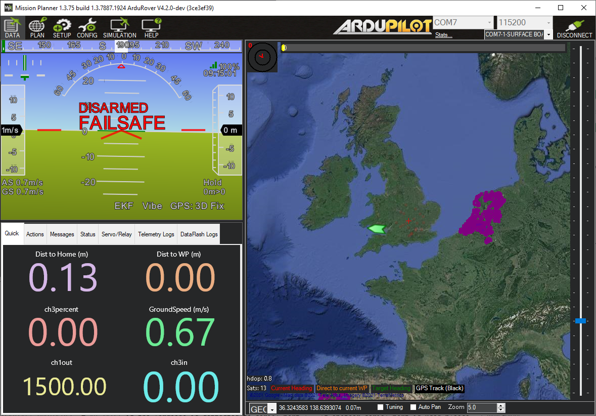 Connect to the autopilot with Mission Planner (or another ground station) and a boat should appear on the South West coast of England