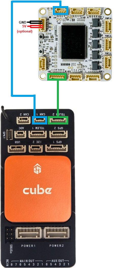 5V Power can be provided through the dedicated power port or through the Serial or CAN port