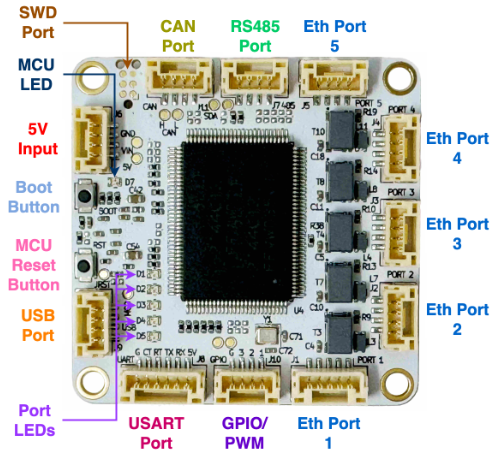 The BotBlox DroneNet ethernet adapter allows STM32 H7 autopilots without built-in ethernet support to connect to ethernet peripherals