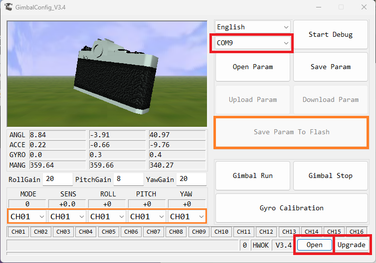 • Open the GimbalConfig application, select the COM port, then “Open” and find the “CwGimbalZGV2Main_V3.4.cahf” file and push “Upgrade”