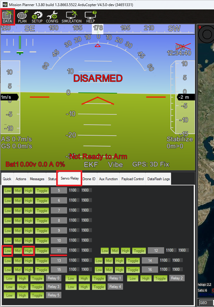 • Open Mission Planner’s Data, Servo/Relay tab, find the row for output 11