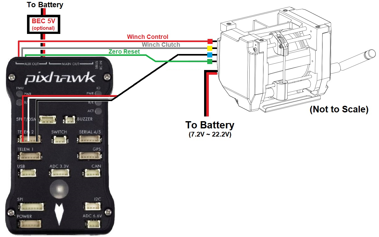 • A 5V BEC can optionally be connected to the autopilot’s servo rail to provide power to the winch electronics. This is not required if the Telemetry wire is connected