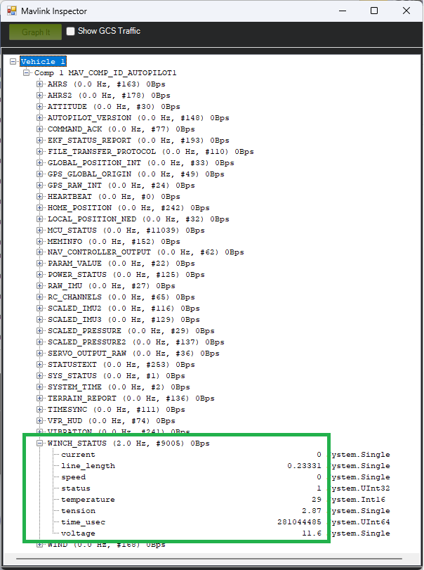 The status of the winch can be viewed in real-time using Mission Planner or QGC’s MAVLink Inspector window. If using Mission Planner push the “MAVLink Inspector” button found under Setup, Advanced.