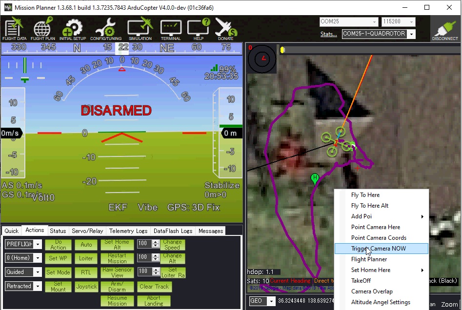 Connect with Mission Planner and right-mouse-button-clicking on the map and select, “Trigger Camera Now”. The camera should emit a click as it takes a picture. Normally a green circle will also appear on the map.