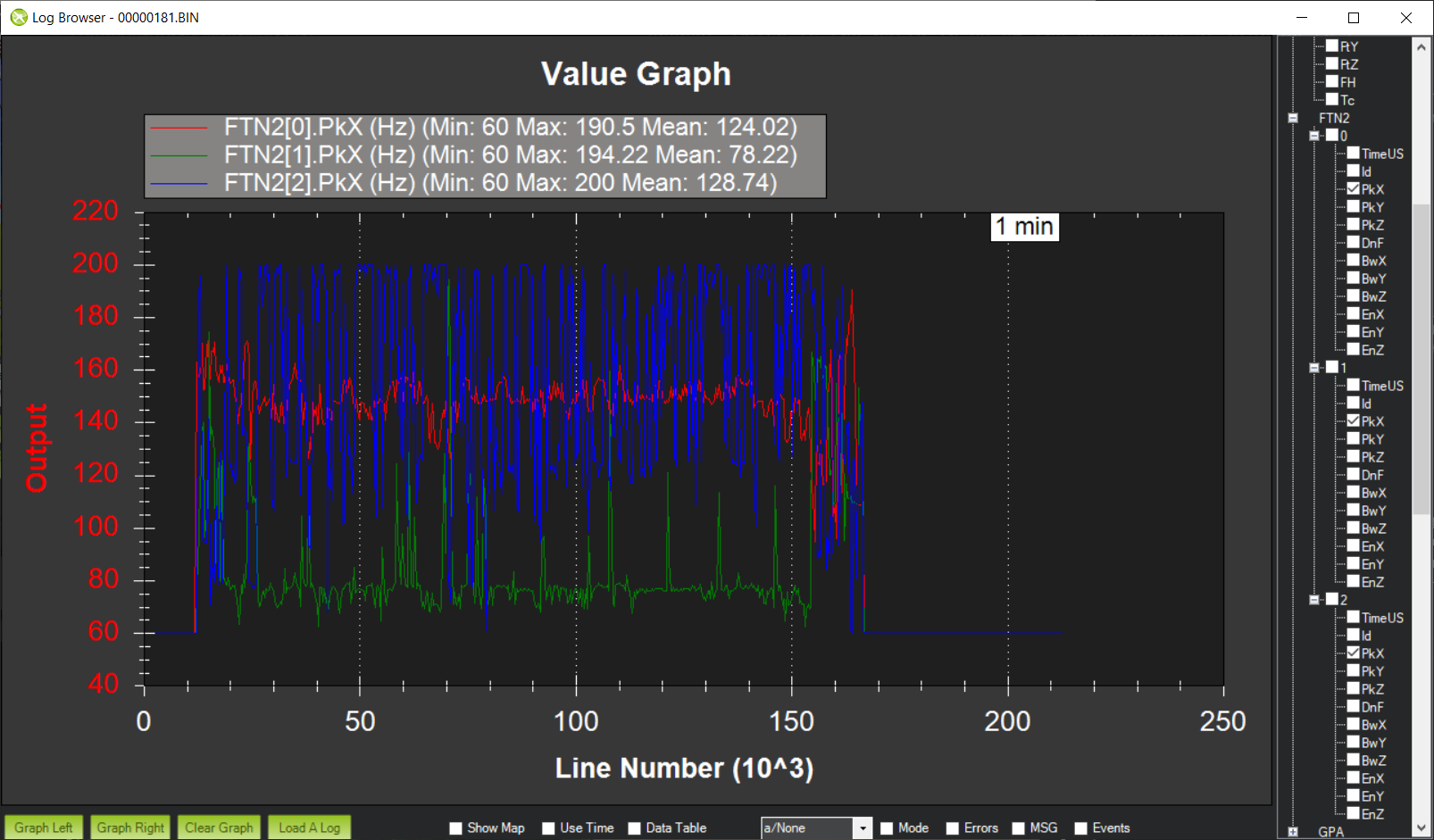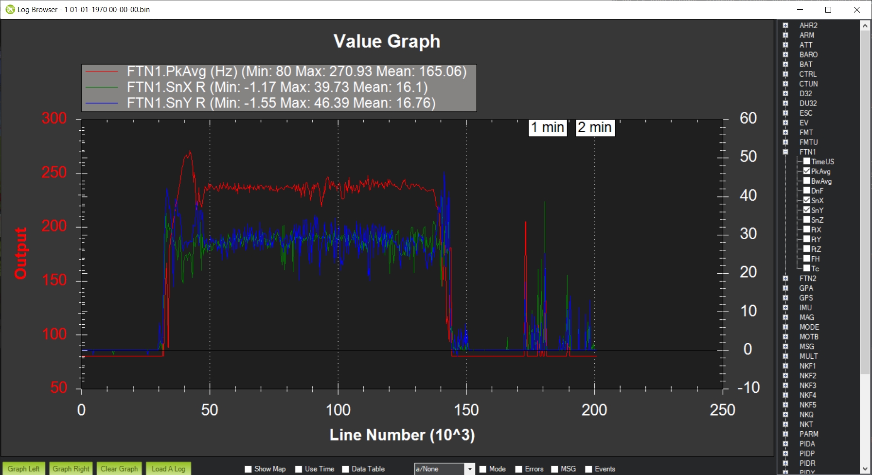 • FTN1.SnX, FTN1.SnY and FTN1.SnZ give an indication of the signal-to-noise ratio of the detected frequency. This value should be above FFT_SNR_REF. For the example flight in Initial Flight and Post-Flight Analysis the SNR was about 58dB.