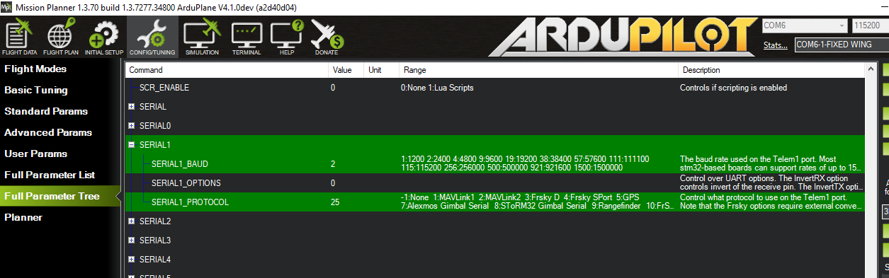 Additionally, not all of your autopilot’s serial ports support the lowest possible baud rate setting of 1 ( = 1200 baud). On STM32F4xx and F7xx based autopilots, these typically are USARTs 1 and 6 that run on the full system clock. If set to 1200 baud, these ports will default to 19200 baud instead. If you have issues getting correct LTM telemetry output at 1200 baud, try using a serial port other that USART 1 or 6 or opt for 2400 baud instead. On STM32H7-based boards, 2400 baud is lowest supported UART baudrate. Check your flightcontroller’s hardware page for further reference on UART to SERIALn mapping.
