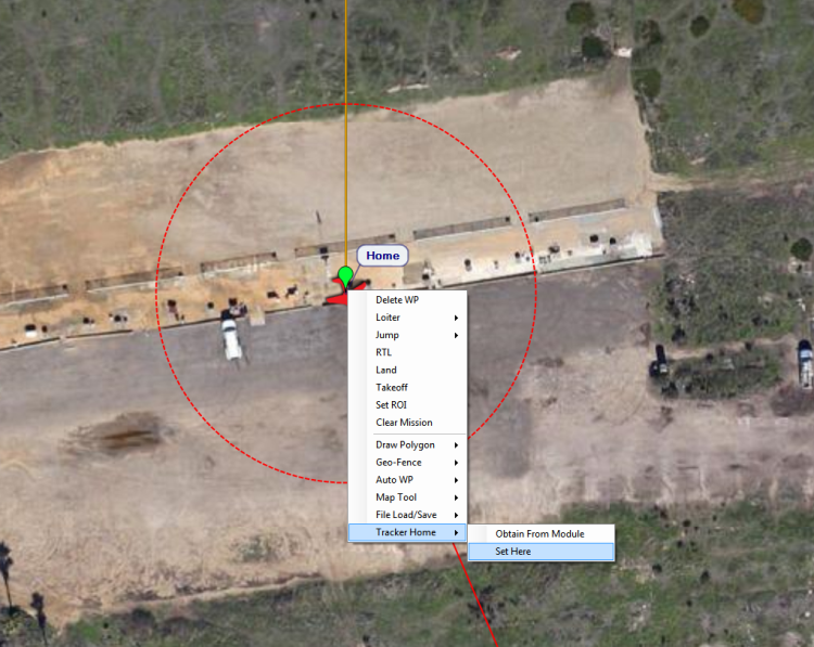 Usually the first thing I do is power up everything and get a solid GPS lock on the APM. After that I’ll set my plane in front of the antenna tracker and zoom in REALLY tightly in Mission Planner under the Flight Planner window. I’ll then right click and say Tracker Home -> Set here.