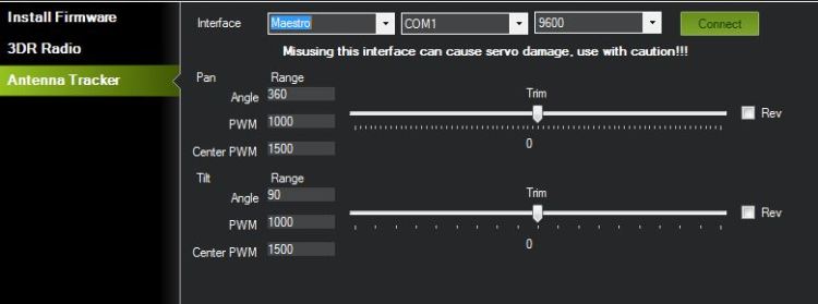 After that I’ll flip over to the Initial Setup tab under Antenna Tracker and pull down the COM port for the Pololu servo controller and go with 9600 baud. When that’s set I hit connect. At that point the tracker should go into motion.