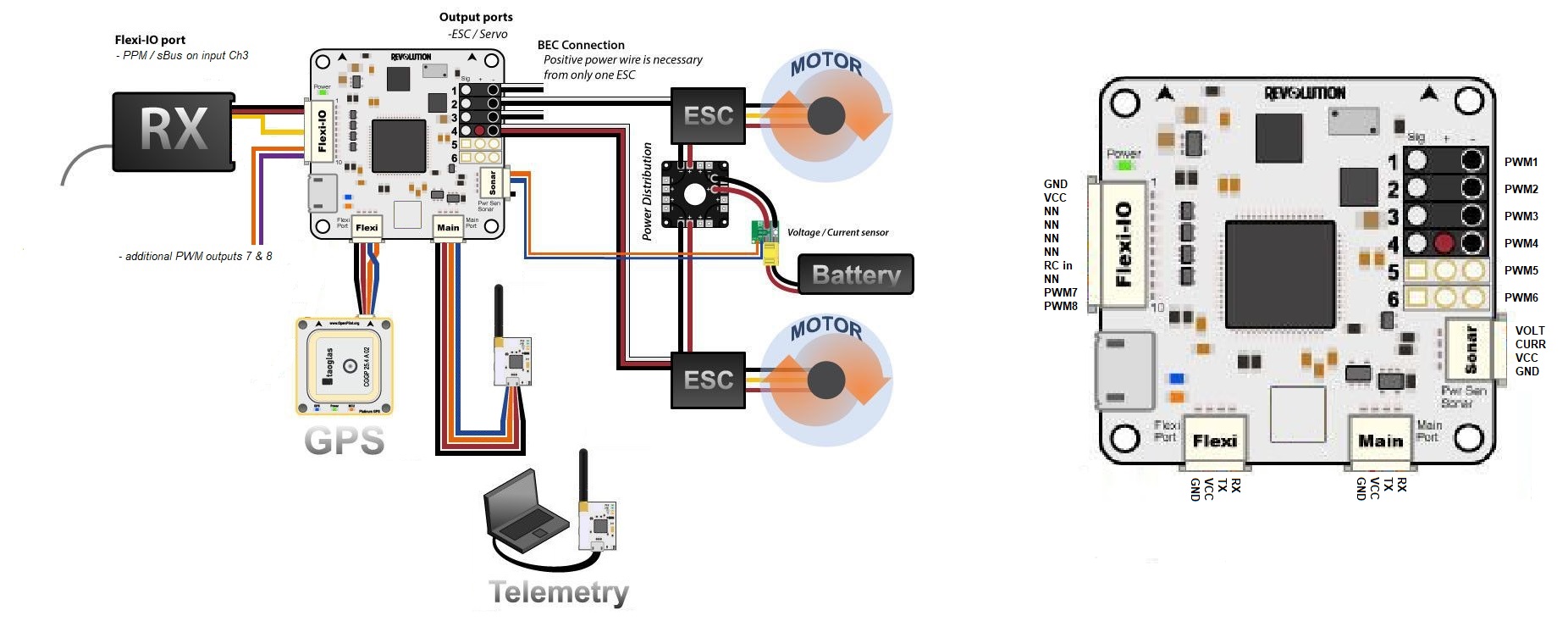 • RC input (requires PPM/sBus) on Flex-IO / RCInput port’s CH3 pin (yellow wire on fullsize revolution)
