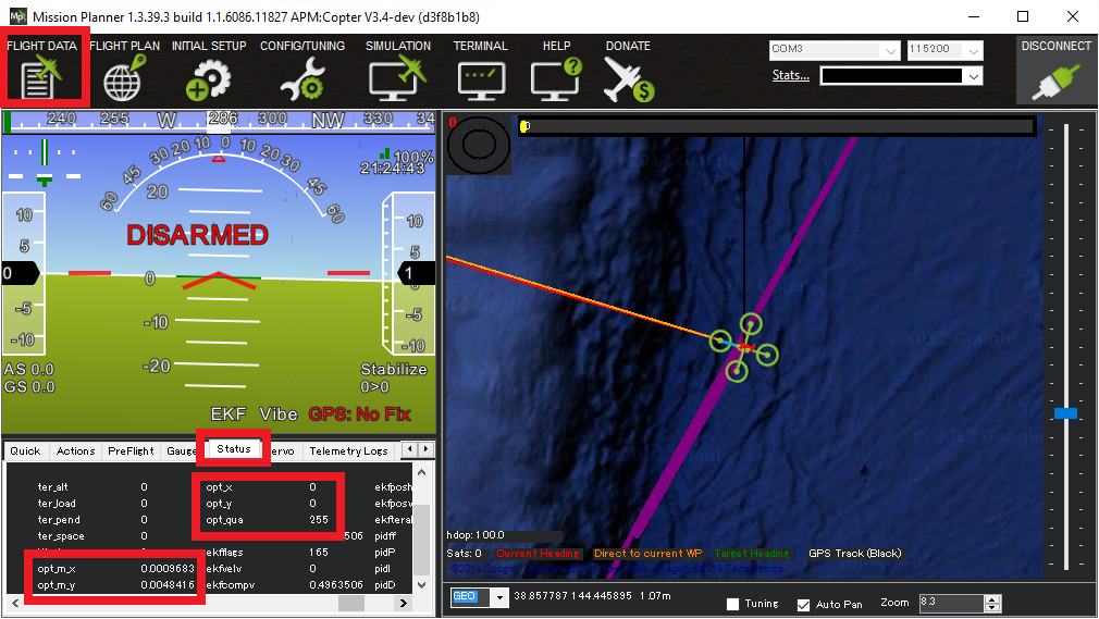 With the sensor connected to the autopilot, connect to the autopilot with the Mission Planner and open the Flight Data screen’s Status tab. If the sensor is operating you should see non-zero opt_m_x, opt_m_y and opt_qua values.