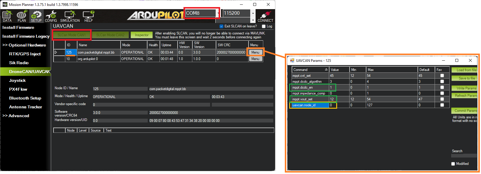 Use Mission Planner’s SETUP >> Optional Hardware >> UAVCAN(DroneCAN) page’s “Menu” button to manually configure the uavcan.node_id of each MPPT