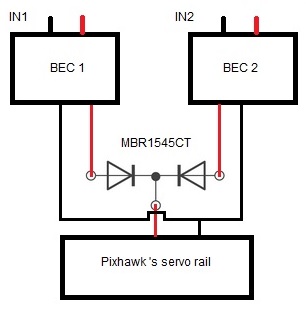 The block diagram below synthesizes an overview of Pixhawk’s power and ESC wiring. In this diagram, a 3DR power module (or equivalent device) powers Pixhawk through its power port (primary source). One power source is enough but obviously not redundant if the power module fails to power this primary source. Therefore the diagram adds a second backup power source via a 5V BEC that wires to Pixhawk’s output servo rail. If the primary source fails, Pixhawk will automatically switch to this second power source.