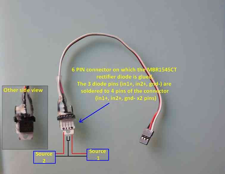 In this scheme, a simple MBR1545CT integrated circuit is used. This circuit takes two BECs on its inputs, and outputs only off the BEC with the highest voltage (i.e. if BEC1 outputs 5.25V and BEC2 outputs 5.45V, MBR1545CT will pass BEC2 and blocks BEC1). Here is a tie bus circuit wiring diagram and example realisation with the MBR1545CT integrated circuit and a 6 pin JST connector:
