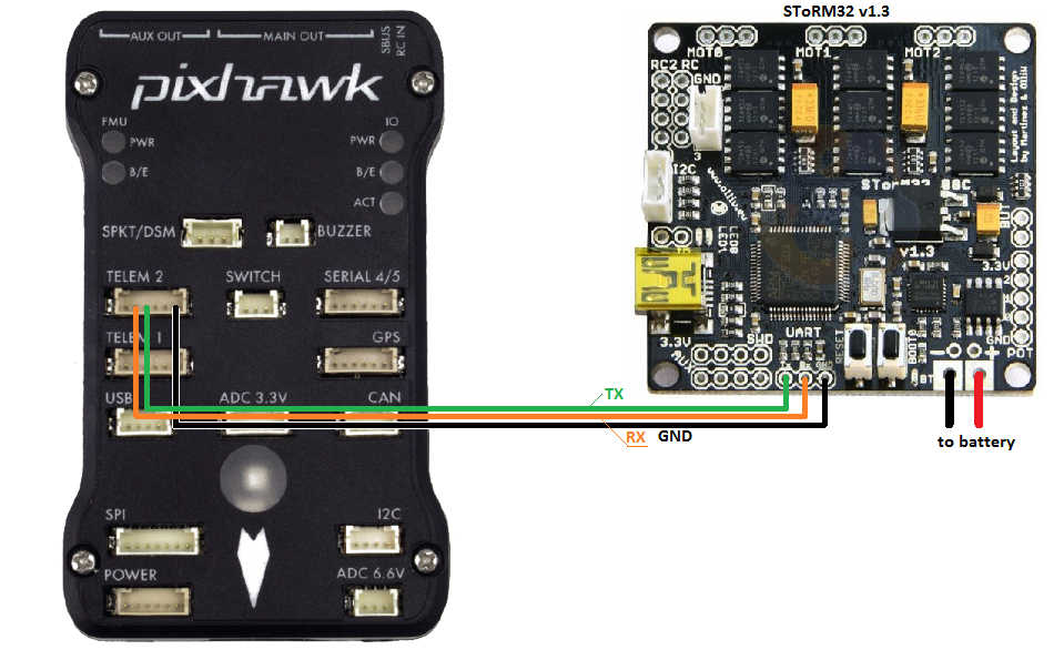Connect one of the autopilot’s serial port’s TX, RX and GND pins to the gimbal’s UART port as shown above. The autopilot’s serial port’s VCC, RTS and CTS pins should not be connected
