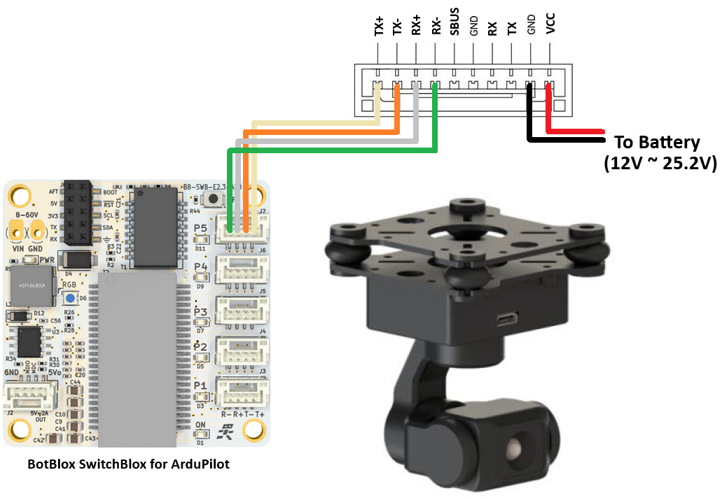 Connect the gimbal’s RX, TX and GND pins to one of the autopilot’s serial ports as shown above.