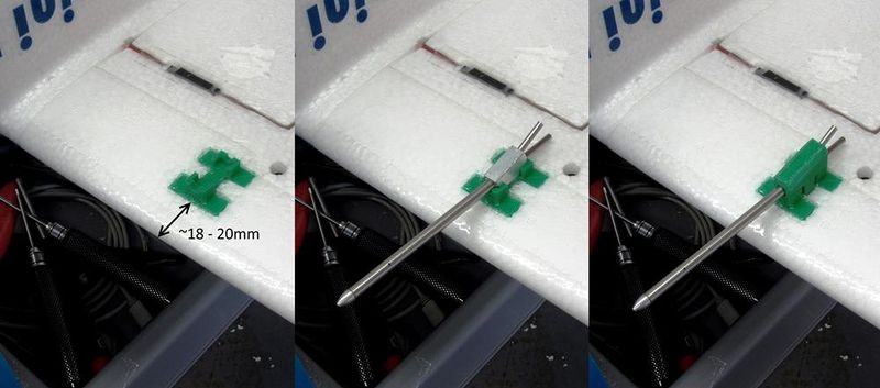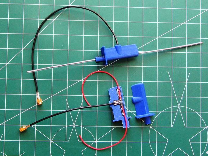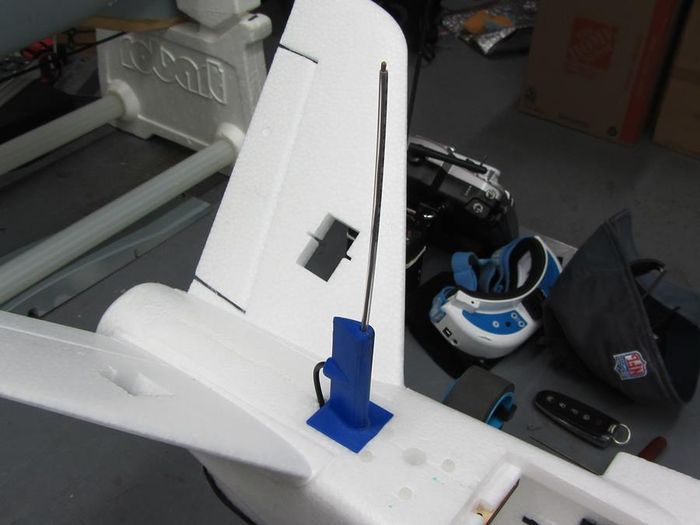If an LRS (Long Range RC System) is utilized, mounting the antenna is critical to achieving maximum distance. Most LRS systems use a dipole. Shown below is a 3d printed mount that assures that both elements are vertical. Any method that assures that the dipole is mounted vertically will be satisfactory.