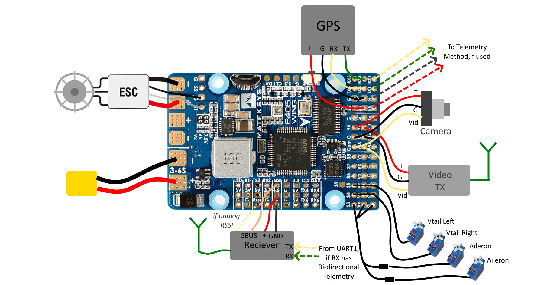 As shown, the GPS and Telemetry connections are compatible with the serial port defaults loaded when the firmware for the Matek autopilot is programmed.