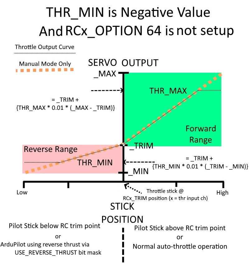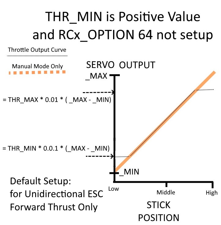 First, its important to understand how non-reverse throttle’s input to throttle servo output functions, when THR_MIN is zero or a positive value and the RC option for a reversing switch (RCx_OPTION = 64) is not setup (the usual case for most planes).