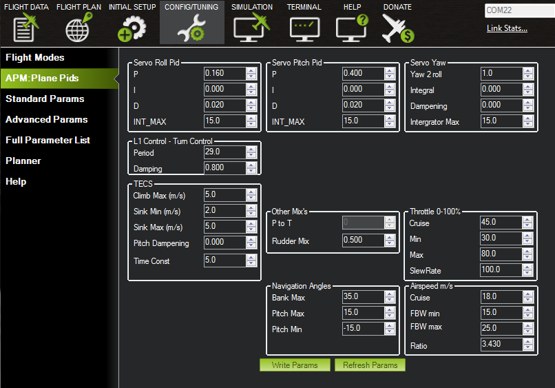 The starting point for Plane tuning is via the Plane PIDs screen shown above. This is where you can tune the Servo Roll and Servo Pitch PID gains to enable flight in FBWA mode, and also enable tuning of the L1 Control for more accurate horizontal positioning.