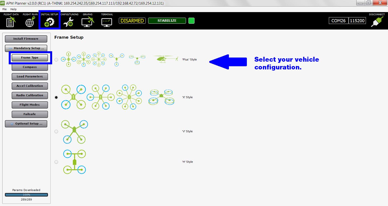 This article explains how to select/calibrate your frame orientation in APM Mission Planner 2 (copter-only). For other calibration tasks, see Autopilot calibration.