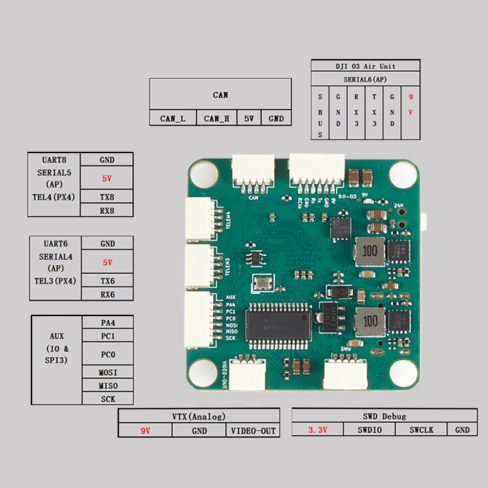 The SH1.0-6P connector supports a DJI Air Unit / HD VTX connection. Protocol defaults to DisplayPort. Pin 1 of the connector is 9v so be careful not to connect this to a peripheral requiring 5v.