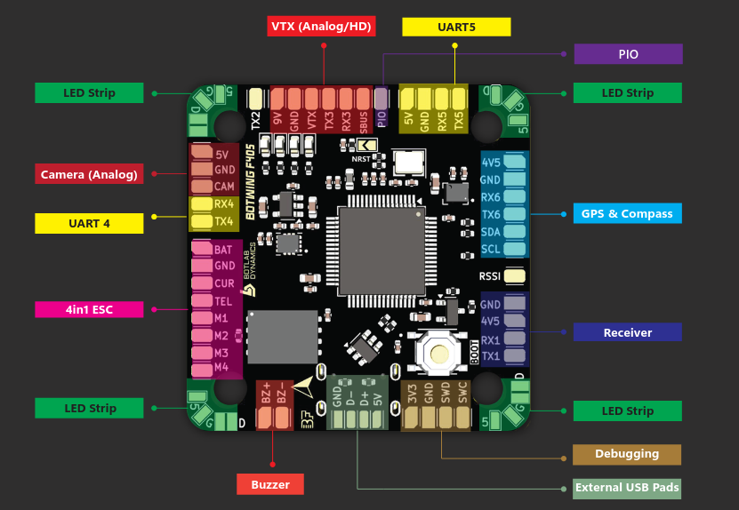 The BOTWINGF405 is a compact, high-performance flight controller developed for fixed-wing and FPV applications. Designed for reliability and flexibility, it integrates essential sensors and features for smooth flight and rich telemetry, produced by BOTLAB DYNAMICS.