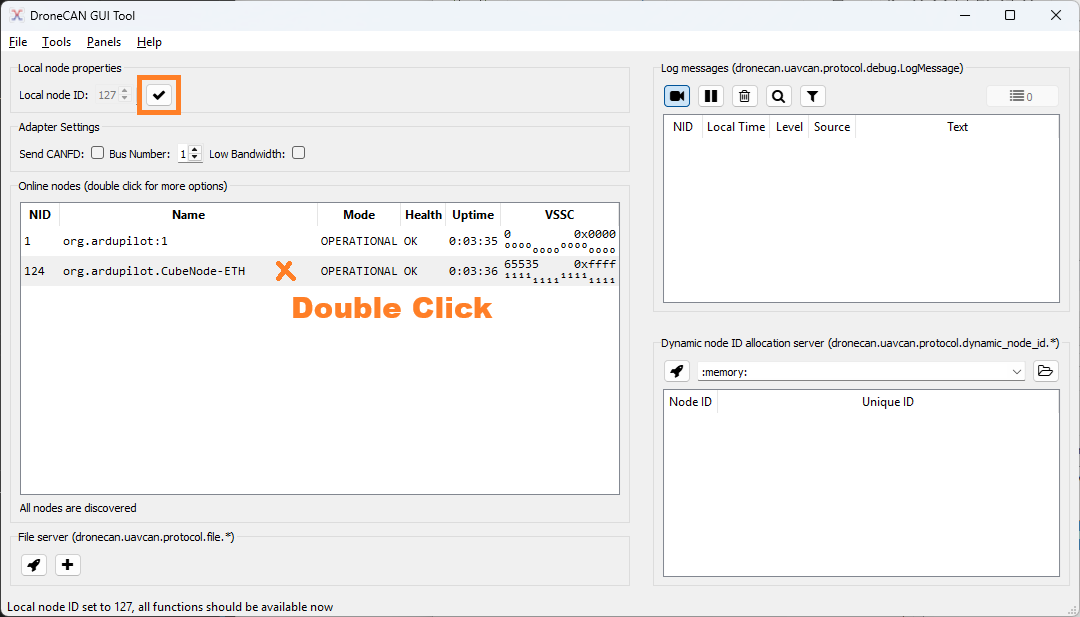 • Uncheck the check box to the right of “Local node ID” to set the DroneCAN GUI Tool’s DroneCAN node ID