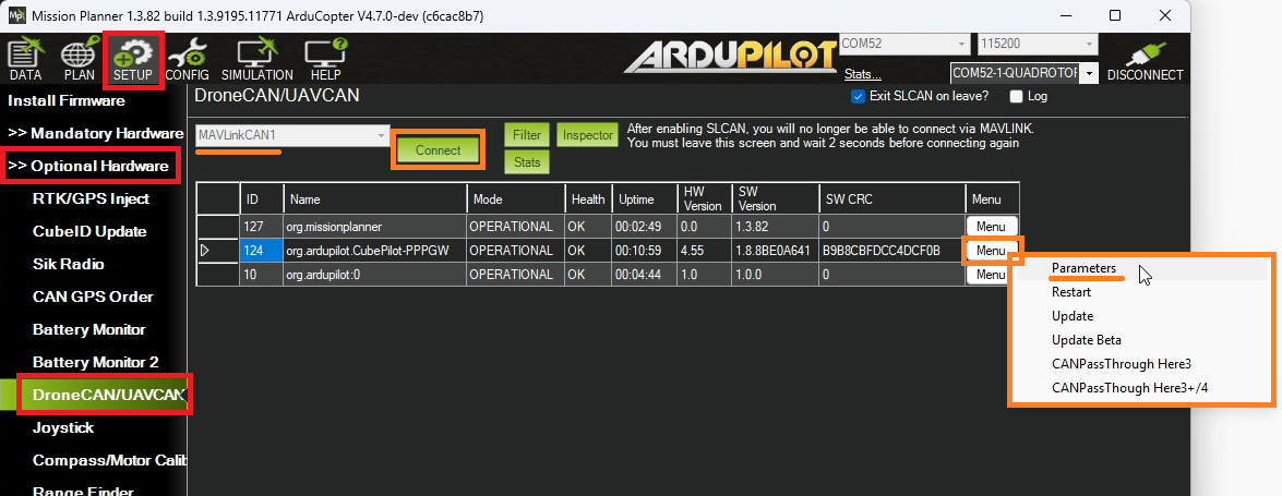 • Open the Setup, Optional Hardware, DroneCAN/UAVCAN screen