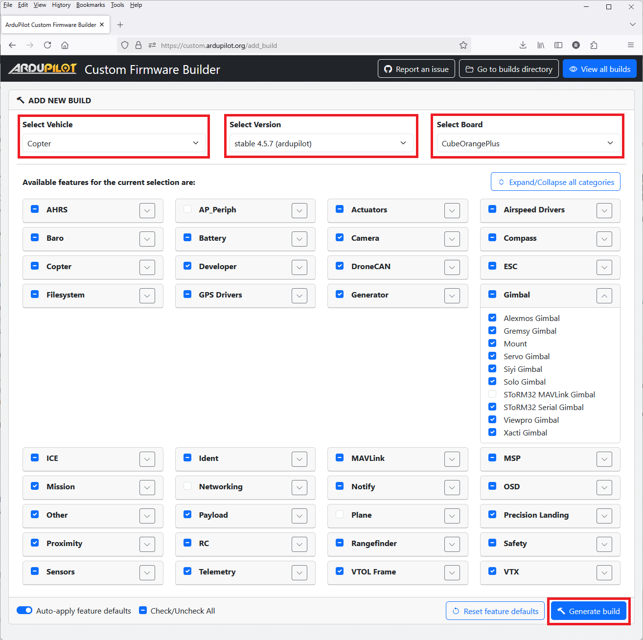 To address this need, we have developed the Custom Firmware Builder, a web application hosted at custom.ardupilot.org. This process helps in reducing the firmware size, making it easier to fit into flight control units (FCUs) with limited flash memory. It also benefits our testers, allowing them to test specific features without needing to upgrade their flight controllers due to space constraints.