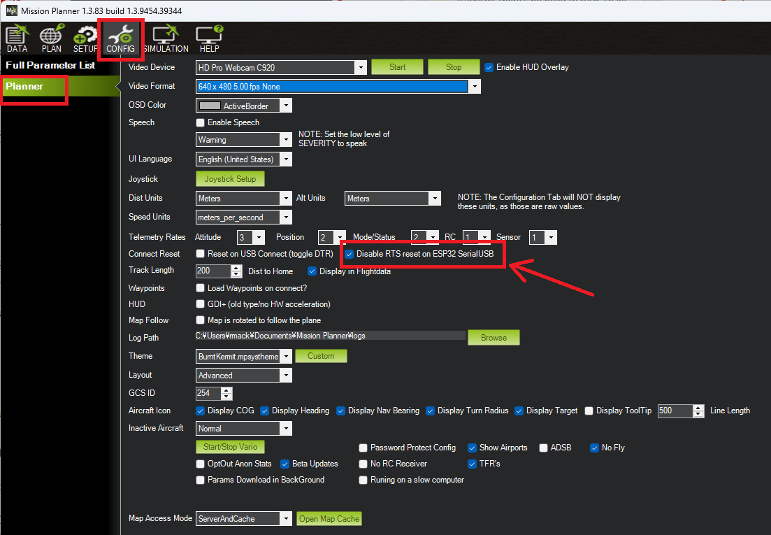 For use with Mission Planner it may be neessary to check the Config, Planner, “Disable RTS reset on ESP32 SerialUSB” checkbox as shown below