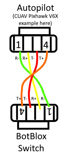 • When you interconnect Ethernet devices, hosts(in our case the autopilot, gimbal, and Herelink) connect to switches with “crossover cabling” , ie device TX pairs go to RX pairs on the switch, and vice versa. In the above cables you will note that the SIYI cable does this, but the others do not. That is because the CUAV autopilot and Herelink have an advanced Ethernet IC that autodetects if the cabling is not “crossover” and internally accommodates this (“Auto MDX”). The SIYI gimbal does not.