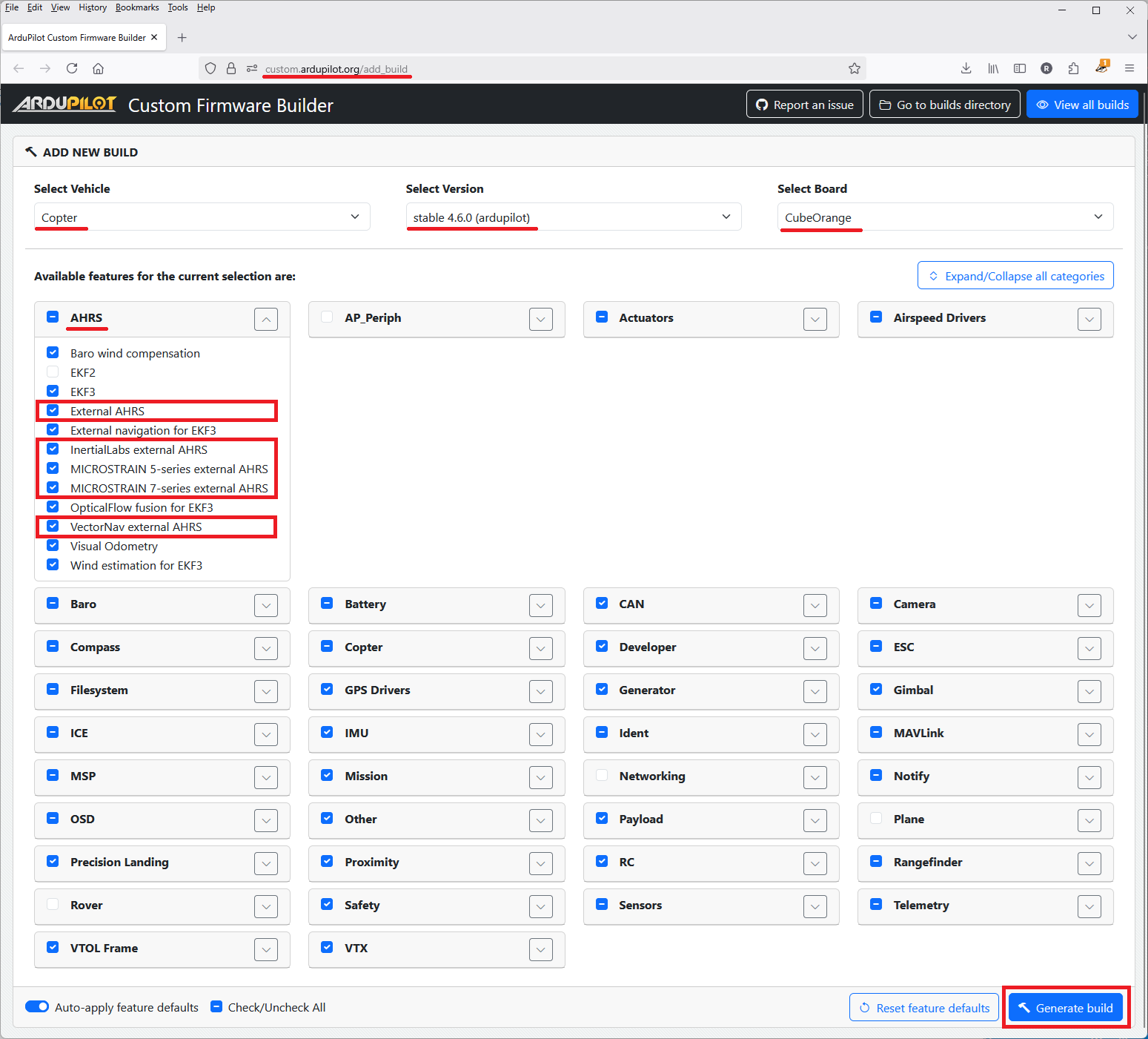 External AHRS support is only available by default in ArduPilot 4.6 (or earlier) on boards with 2MB (or more) of flash. If using 4.7 (or higher) and/or boards with less than 2MB flash, please use the Custom Build Server to build your preferred firmware including External AHRS support.
