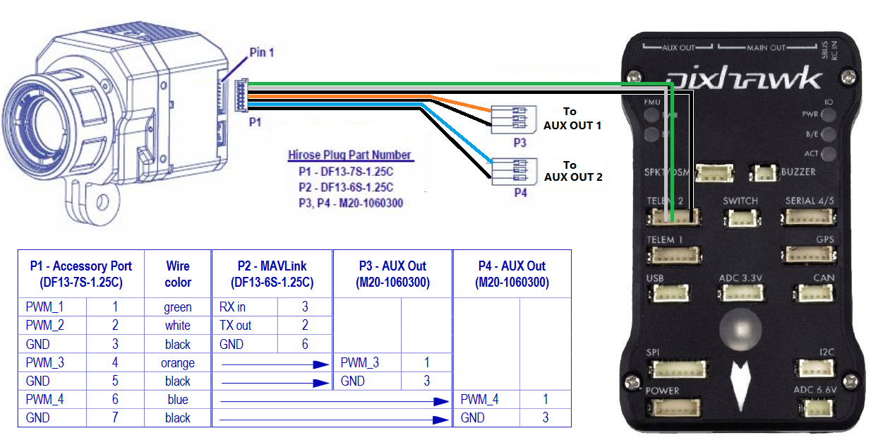 Plug one end of the accessory cable into the camera’s 7-pin DF13 connector (found next to the micro USB port) and then the other 6-pin connector to one of the autopilot’s telemetry ports. In this example Telem2 is used.