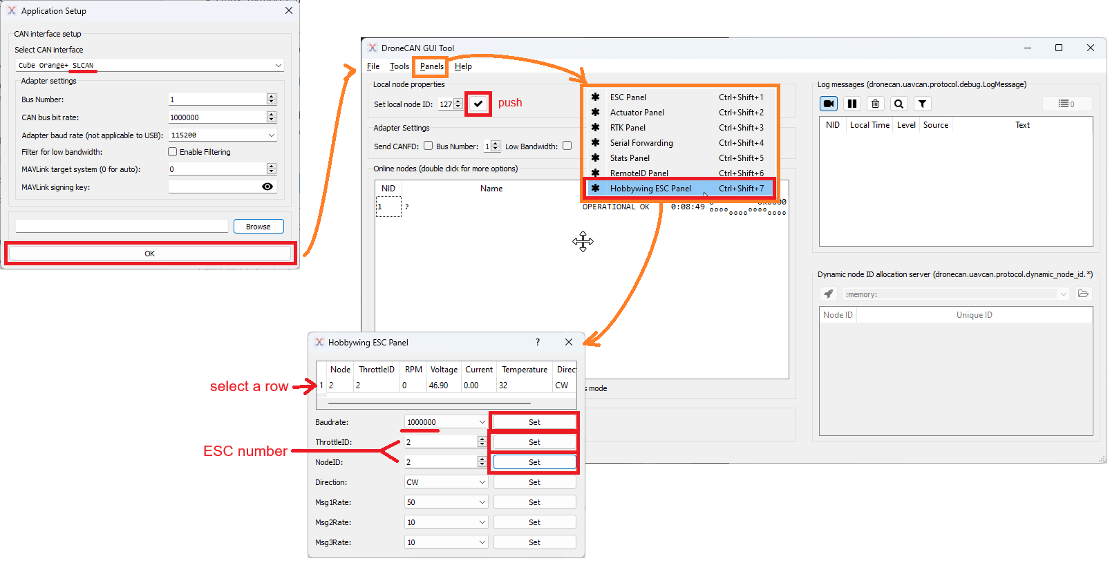 By default the ESCs come from the factory with an incorrect baudrate (500,000 instead of 1,000,000) and all IDs are set to 1 (the first motor). The instructions below show how to configure the ESCs to use the correct baudrate and individual ID for each ESC.
