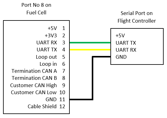 Connect the UART from the port No 8 on the fuel cell to any serial port on your autopilot. See device user manual for details on where to find port No 8. Only the GND, UART TX, and UART RX connections are required. See the diagram below: