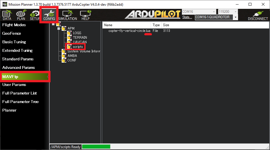 APM/scriptsfolder.If this folder does not exist, you can create it by setting SCR_ENABLE to 1 and rebooting. This folder can also be created manually on the SD card.