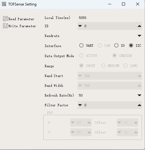 Setup the sensor through the NAssistant Software provided by the manufacturer. More details can be found here. For I2C mode, in the setup screen set “Interface” to I2C. You can also set the “ID” to a unique number if planning to use multiple TOFSenseF. The I2C adress of the sensor is linked to the ID set in the NAssistant software. The default address is 0x08 for ID 0 (or 8 in decimal; i.e the parameter you will set in the GCS), 0x09 (or 9) for ID 1 and 0x10 (or 10) for ID 2. The address can be calculated as 0x08 + ID. For example, if the ID is set to 2, the address will be 0x0A (or 10).