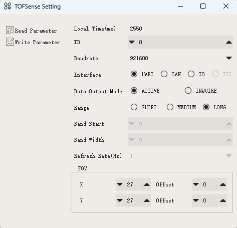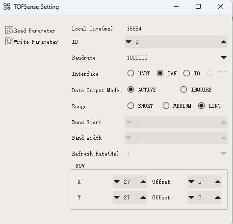 Setup the sensor through the NAssistant Software provided by the manufacturer. More details can be found here. For CAN mode, in the setup screen set “Interface” to CAN, Mode to “active”, and bitrate to “1000000”. You can also set the “ID” to a unique number if planning to use multiple TOFSenseP on a single CAN bus. Setting ID to 0 will accept all ID’s.