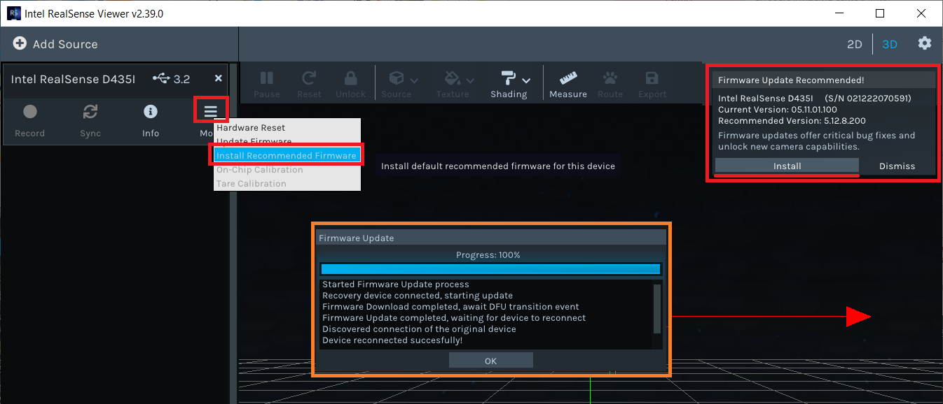 If using the Intel RealSense Viewer after downloading and installing, connect the camera to your PC with a USB3 cable. The firmware upgrade can be triggered via a pop-up on the top right of the application or from the “More” menu as shown below