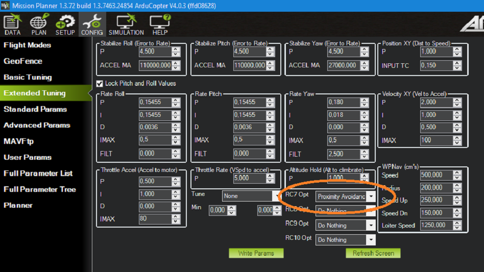 Optional: You can assign an RC switch to enable Avoidance instead of always on by default. Example of setting RC7 to switch Avoidance on in Mission Planner: