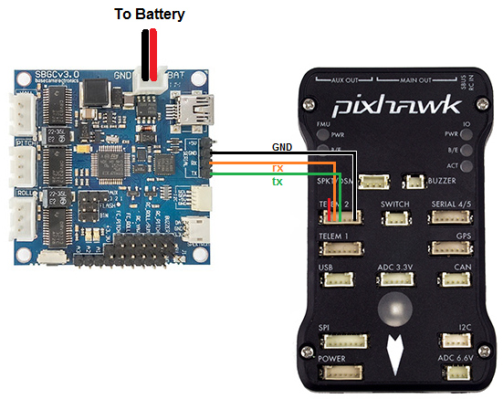 Although the SimpleBGC can be connected using PWM we recommend using the serial interface connected to one of the autopilot’s Serial/Telemetry ports like Telem2 as shown above.