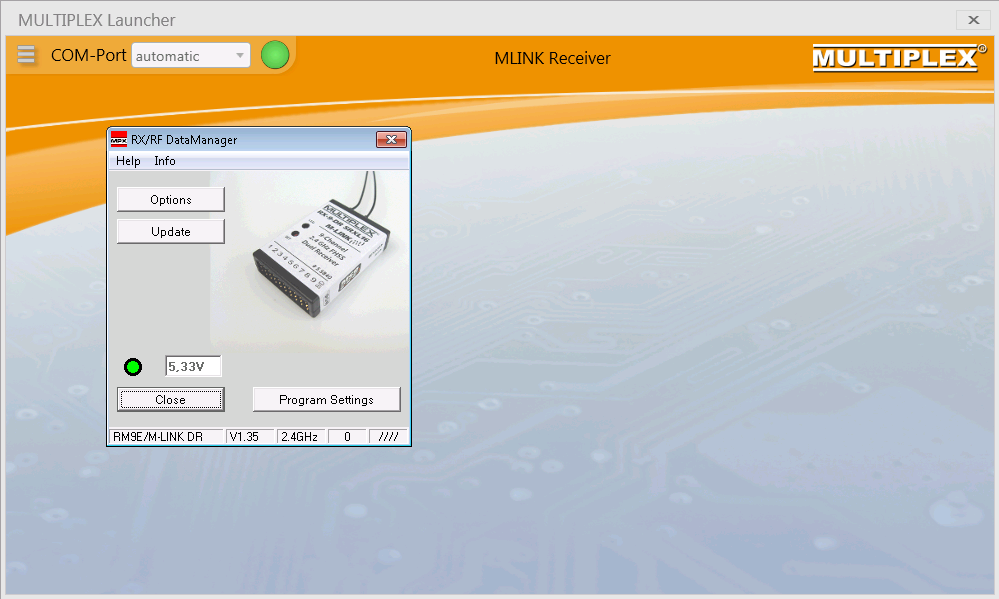 • MULTIPLEX Launcher will detect the connected device automatically and will open the “RX/RF DataManager”-Window.
