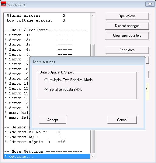 • In the “RX-Options” Window scroll down to “More Settings”. In the “More Settings” section double-click “* Options…” to open the “More setting”-Window and select “Serial servodata SRXL” as data output at B/D port. Close the “More setting”-Windows by clicking “Accept”.