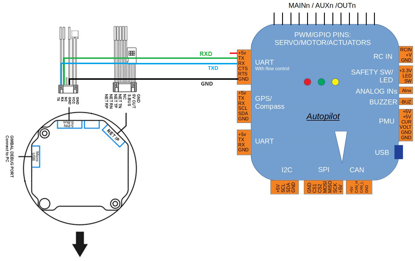 Connect the gimbal’s RX, TX and GND pins to one of the autopilot’s serial ports as shown above.